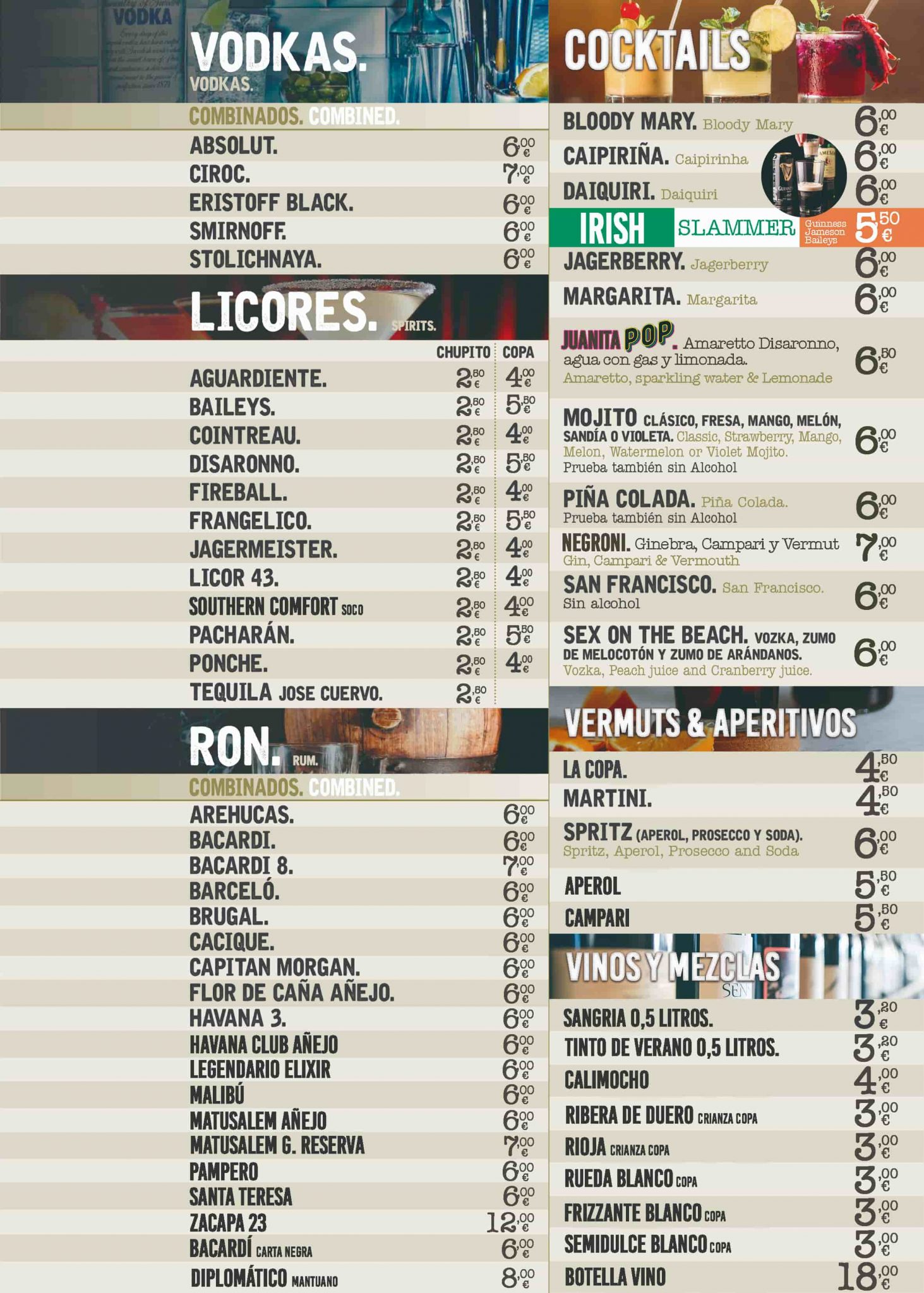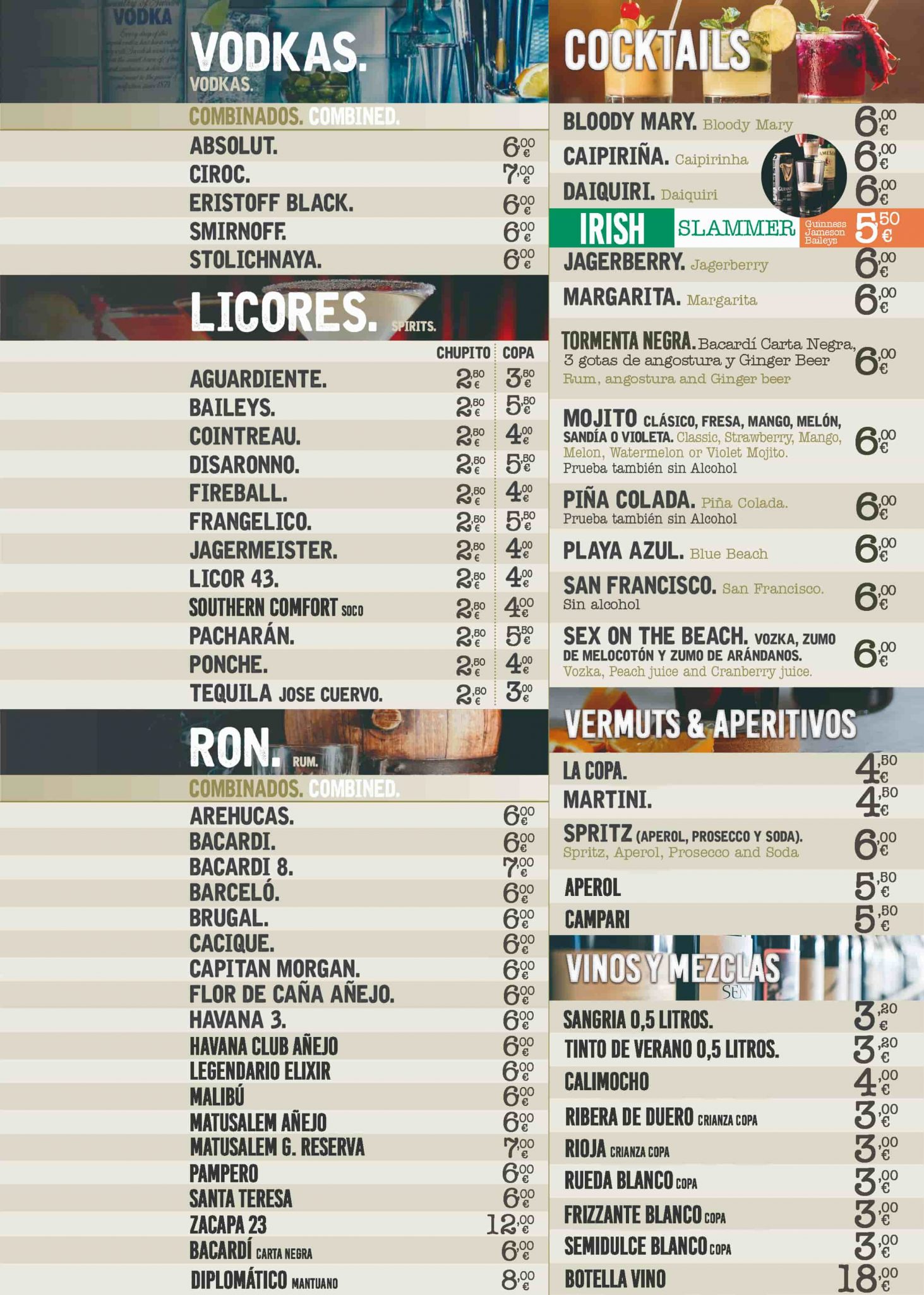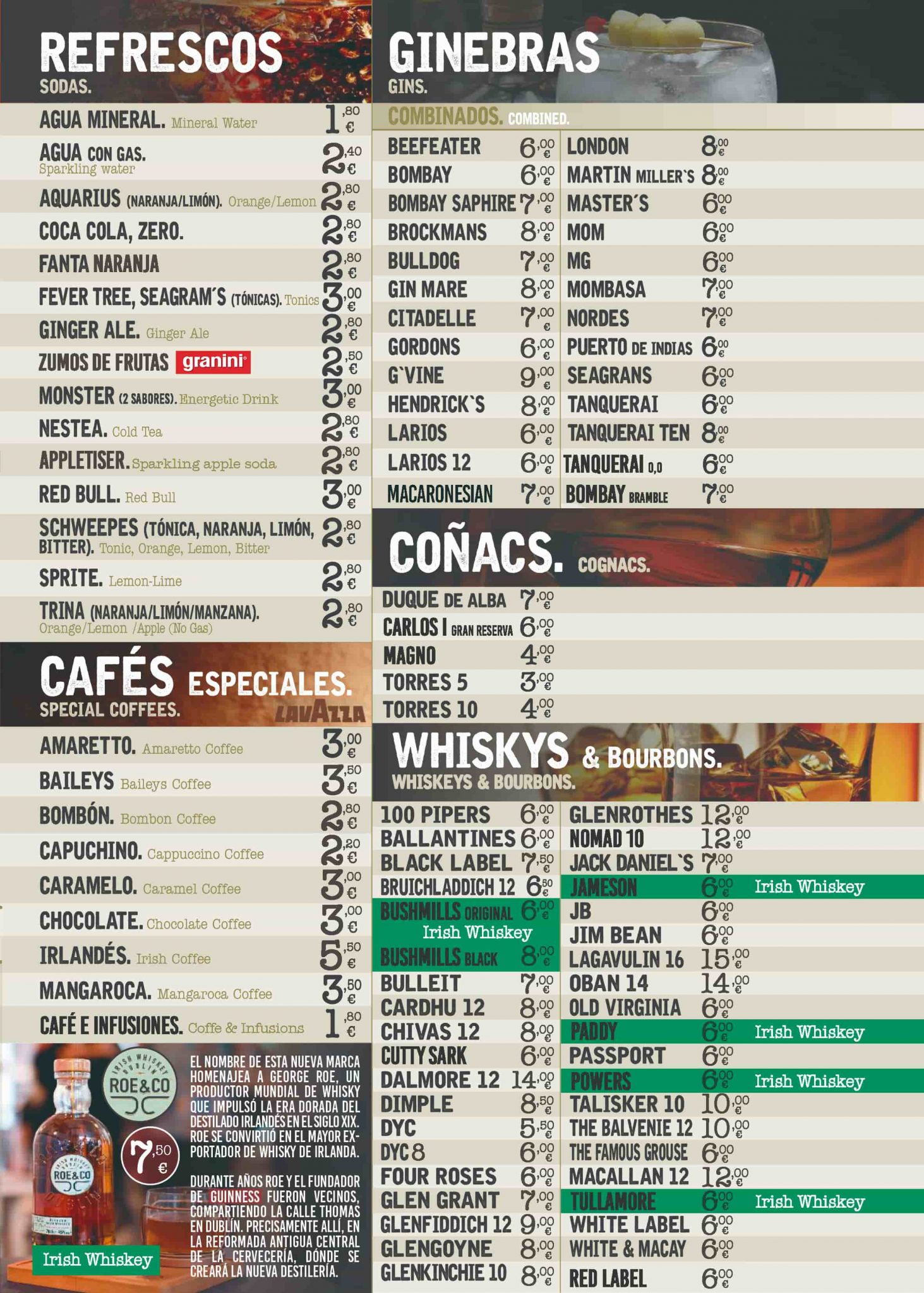 Refrescos, cafés, ginebras, coñacs + de 50 whiskeys, vodkas, licores...